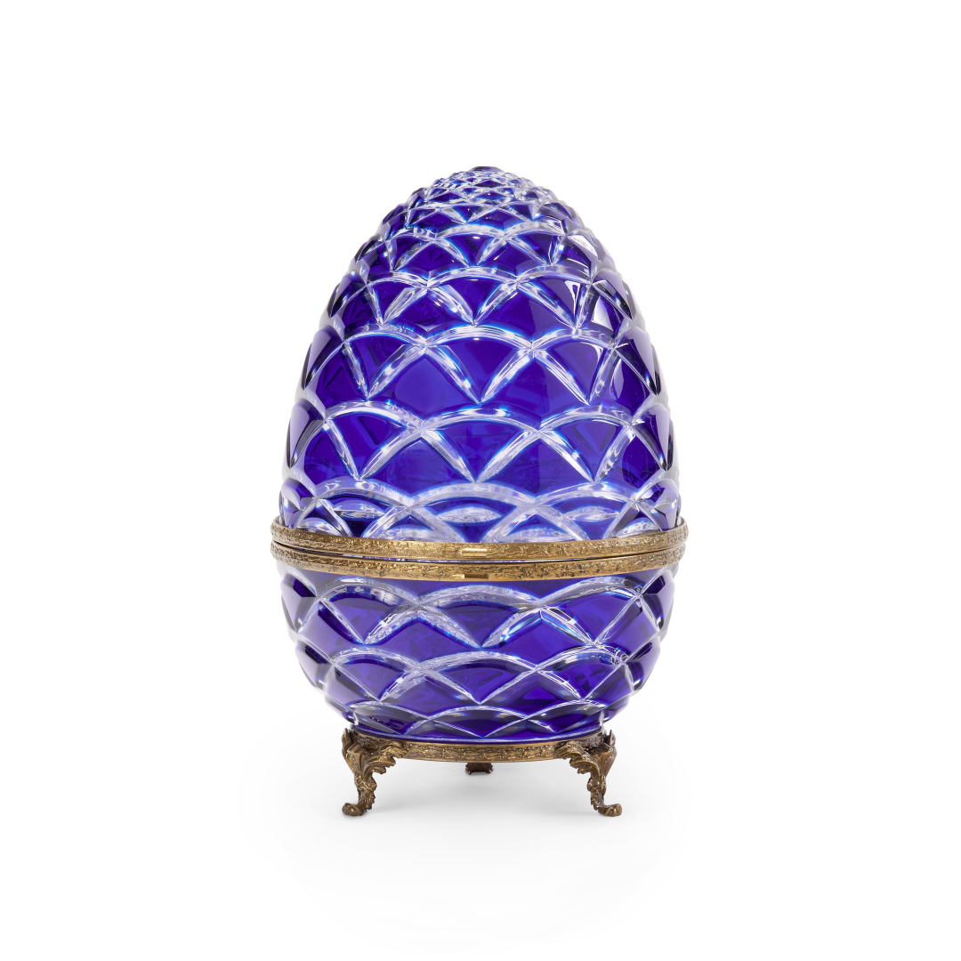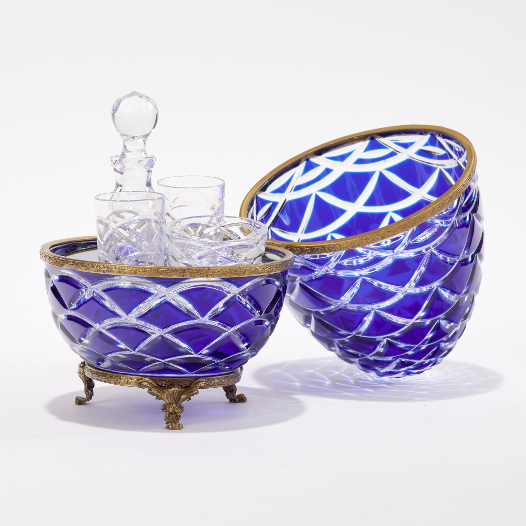 Cobalt crystal and gilt-bronze egg-shaped box, contains a decanter, two small glasses and a caviar bowl on top of an ice container, hinge and base with ferine feet, marked Fabergé France.