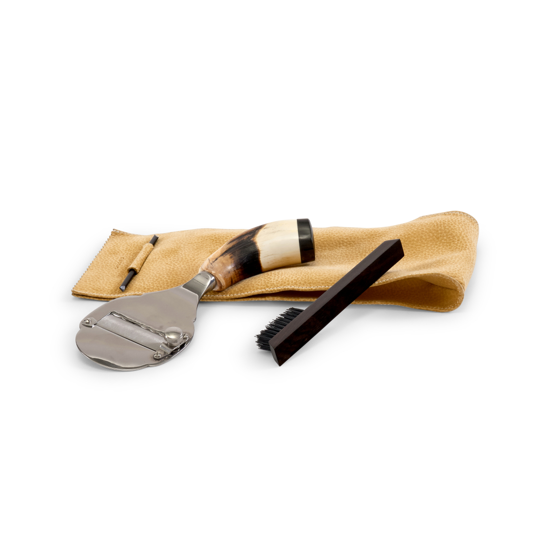 Wood, bristles, bone and steel comprising a grater and truffle brush.