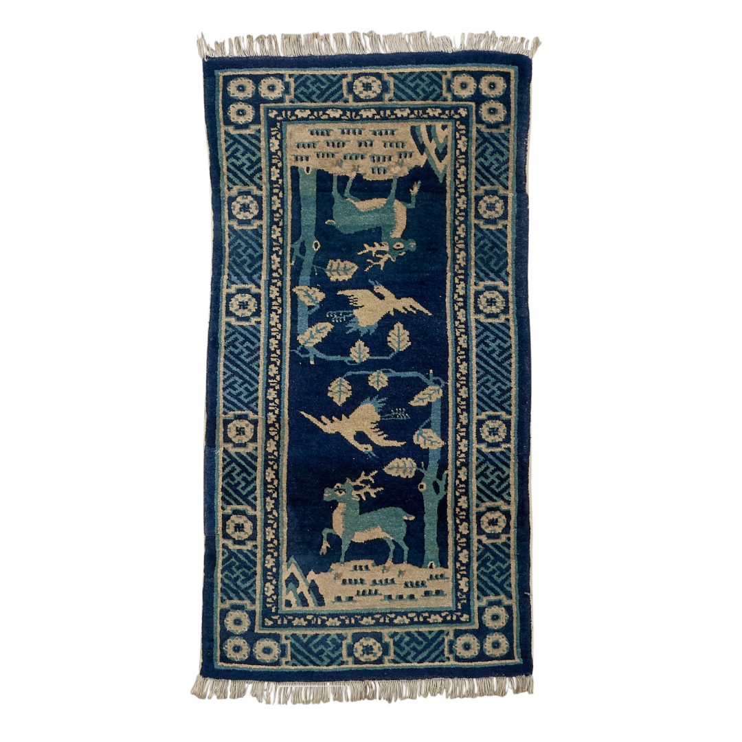 The motif of the deer and the crane is a 'classic' in Baotou production (L. Larsson jr, Carpets from China Xinjiang & Tibet, London 1988, p. 71, fig. 72 for a similar example dated to the end of the 19th century).
