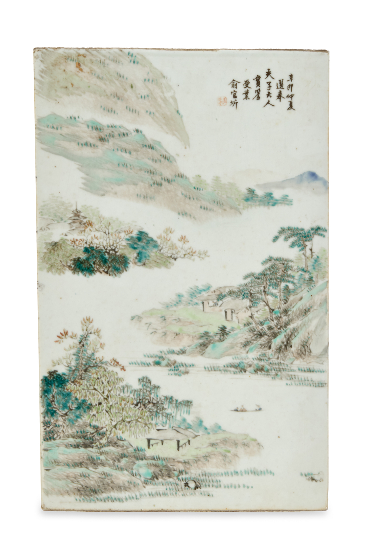 Polychrome painted porcelain, lake landscape with mounts, trees and pavilions, inscribed with signature and seal at the top right.