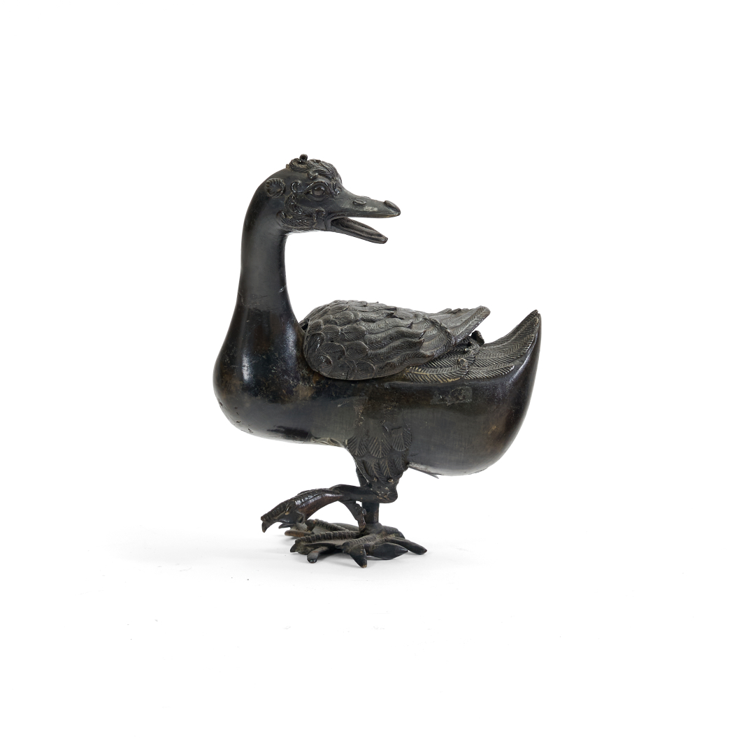 Bronze, modeled in the form of a duck with its neck and beak pointing backwards, its left leg raised, the feathers on its back, the flanks and head with incised details.
