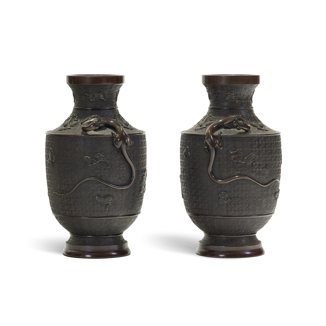 Bronze with a reddish patina, the external surface decorated with clouds and stylized insects in relief on a ground of geometric motifs, a sinuous dragon between the shoulder and the body.