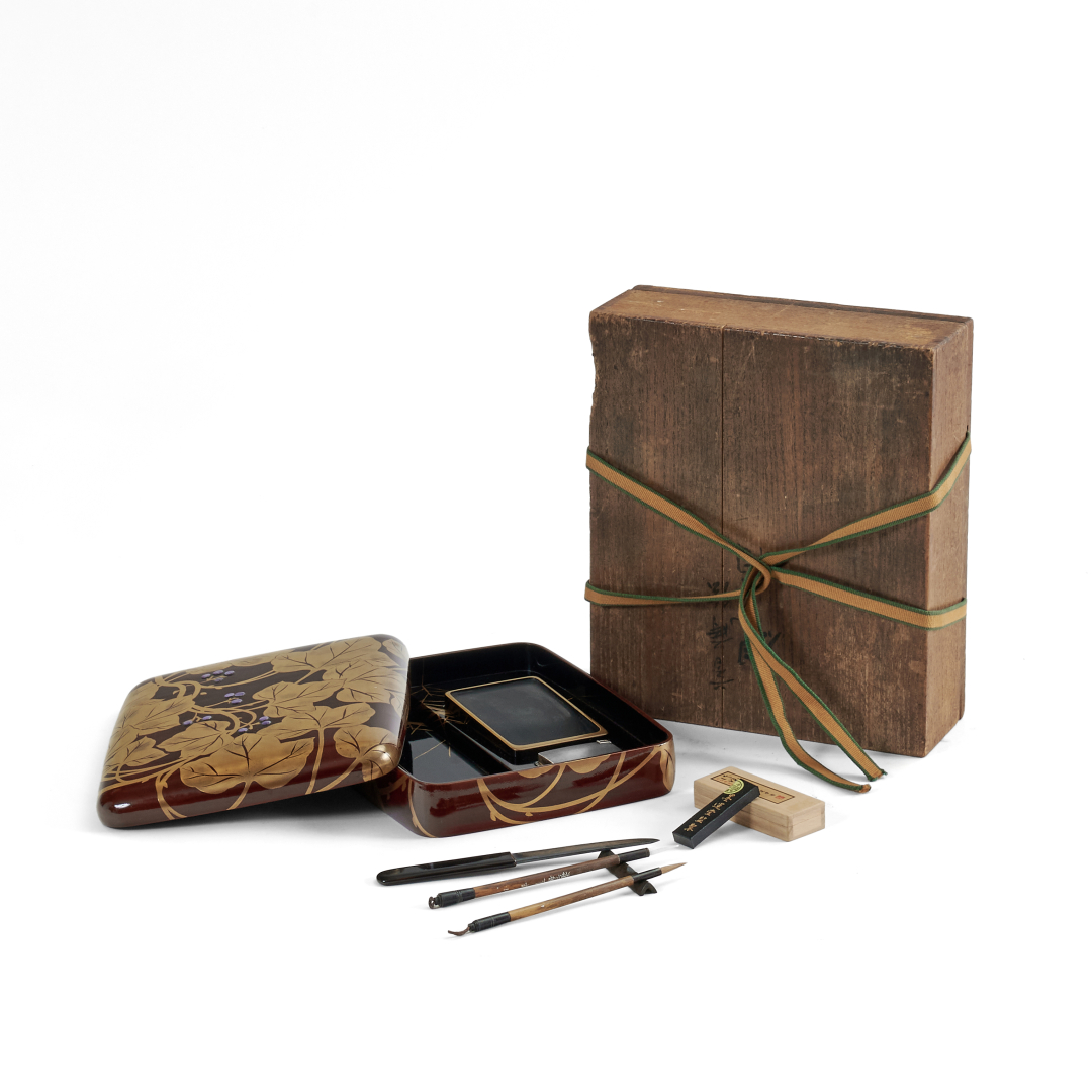 Writing box in wood lacquered in polychrome and gold, the lid with carnelian inlays, complete with all accessories, the decoration on the lid with leaves, the interior with stems, work of Mitsukoshi, together with its original box (tomobako).