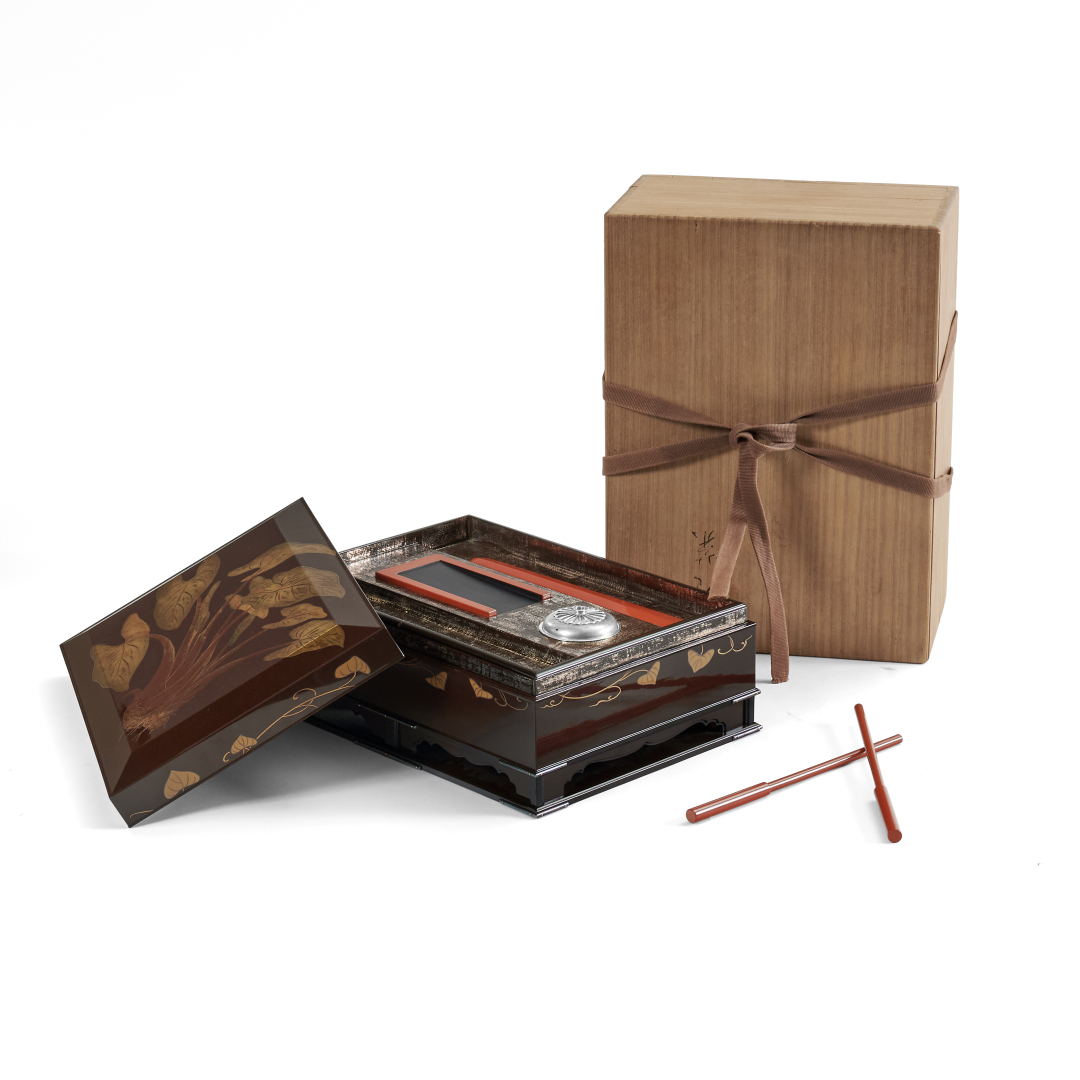 Large writing box with ample storage space on the lower section, supported by bracket feet, made of lacquered and gilded wood and decorated with floral motifs, inkstone and metal water dropper, together with its original box (tomobako)