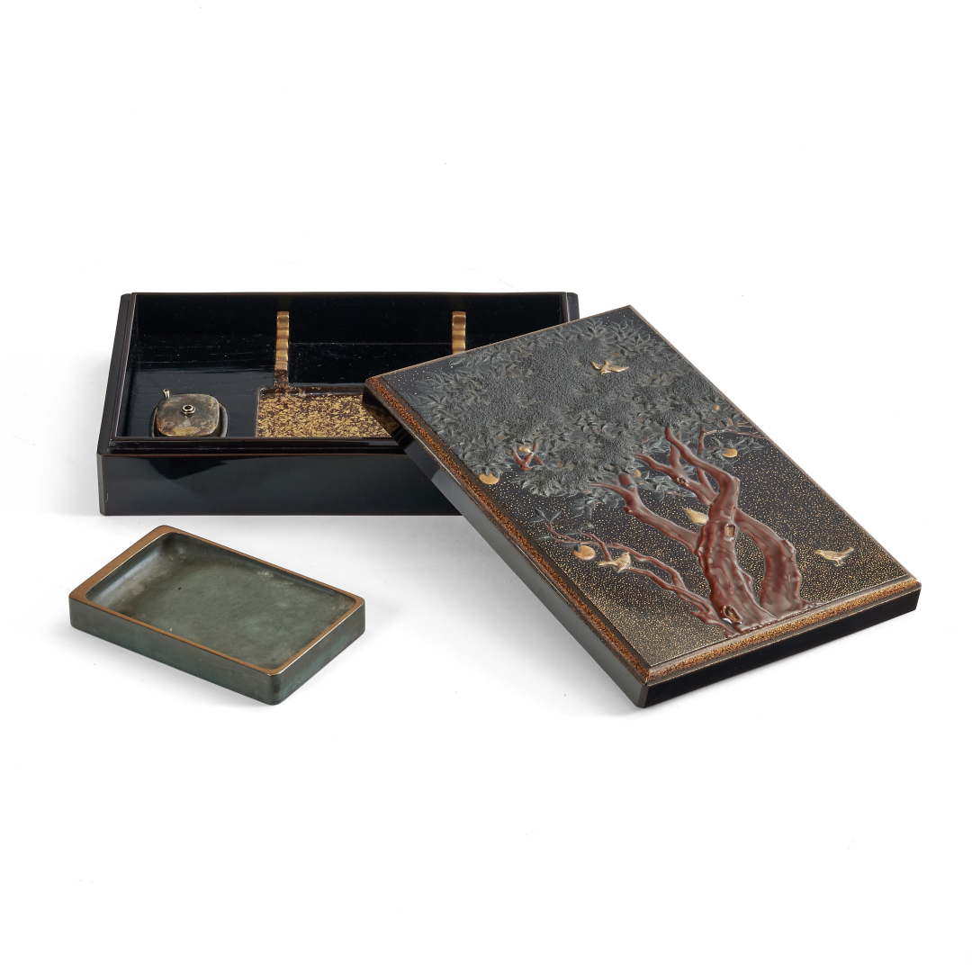 Writing box made of lacquered wood with relief and polychrome decoration, containing an inkstone and a metal suiteki water dispenser, the outside of the lid decorated with a large fruit-bearing tree with some birds flying around.