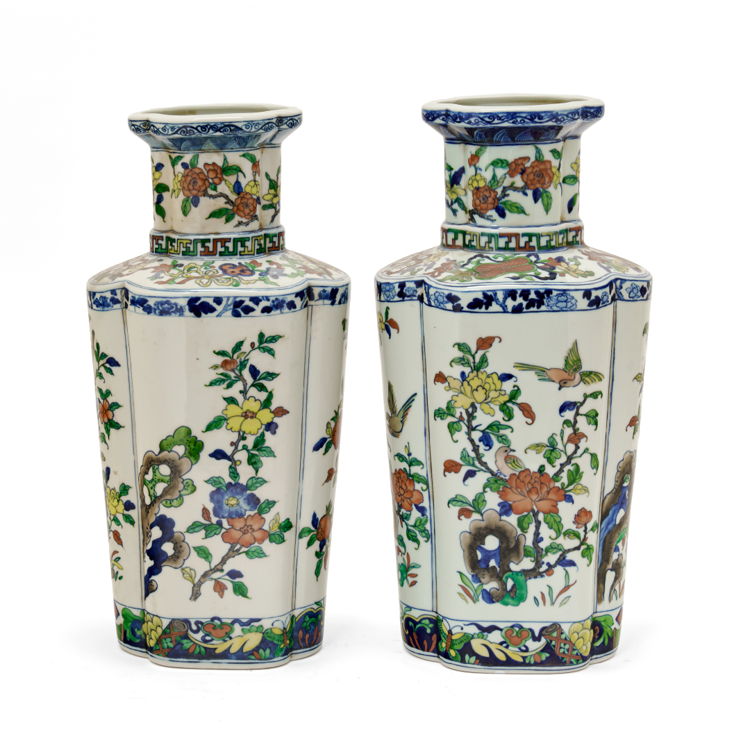 Porcelain painted with polychrome enamels, quadrilobed section, decoration of flowers, fruits, rocks and birds, apocryphal Kangxi mark to the centre of the base of both.