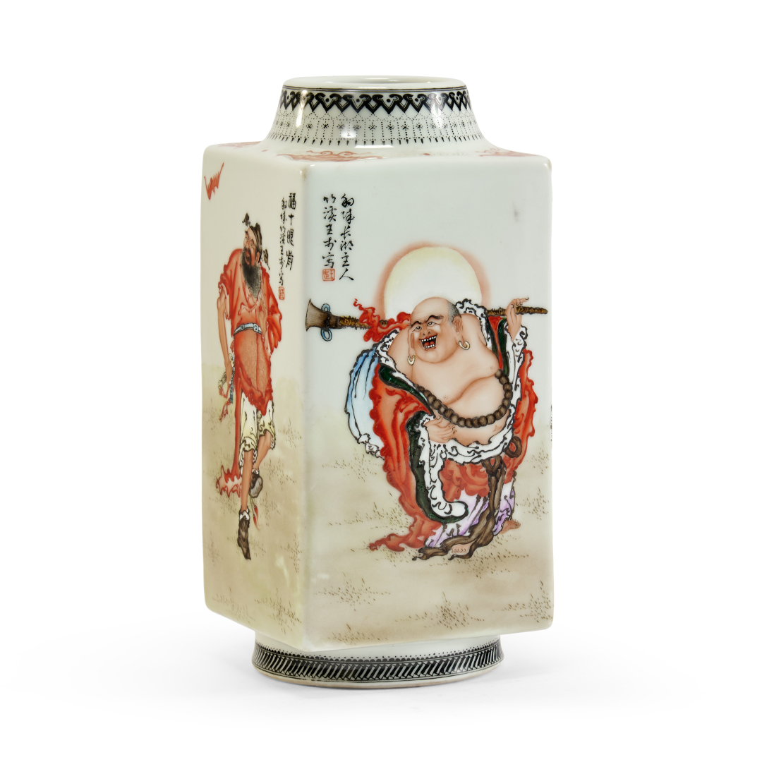 Porcelain painted with polychrome enamels, square section, on each side a figure of a lohan with inscription and seal, mark to the centre of the base.