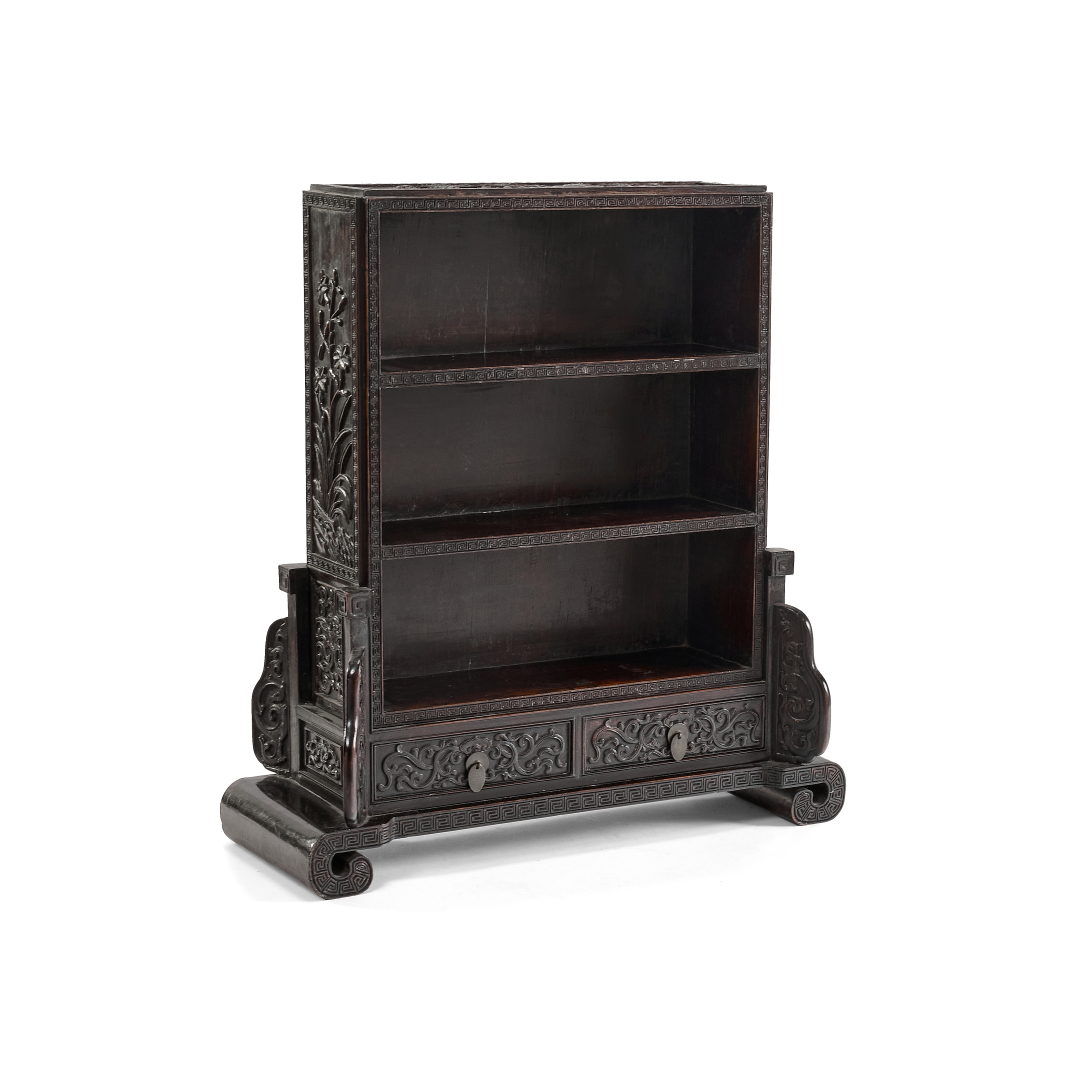 Finely carved wood, the three-compartment display case standing on a base with two drawers and shaped feet, adorned with floral arabesques and embossed leiwen bands.