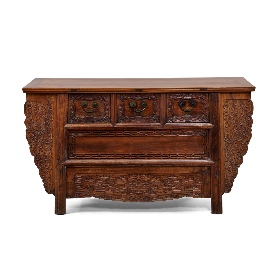 Carved wood and metal accessories, three drawers at the top, the refined decoration consisting of stylized motifs in light relief.