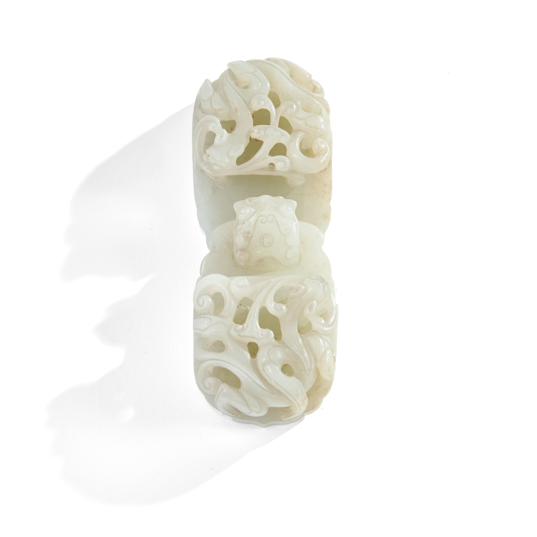 Carved and incised very pale green jade, decorated with qilong dragons and lingzhi mushrooms.