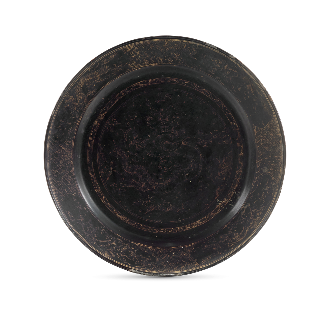 Lacquered wood with traces of gilding, decoration of dragons on the rim within cartouches reserved on a geometric ground.