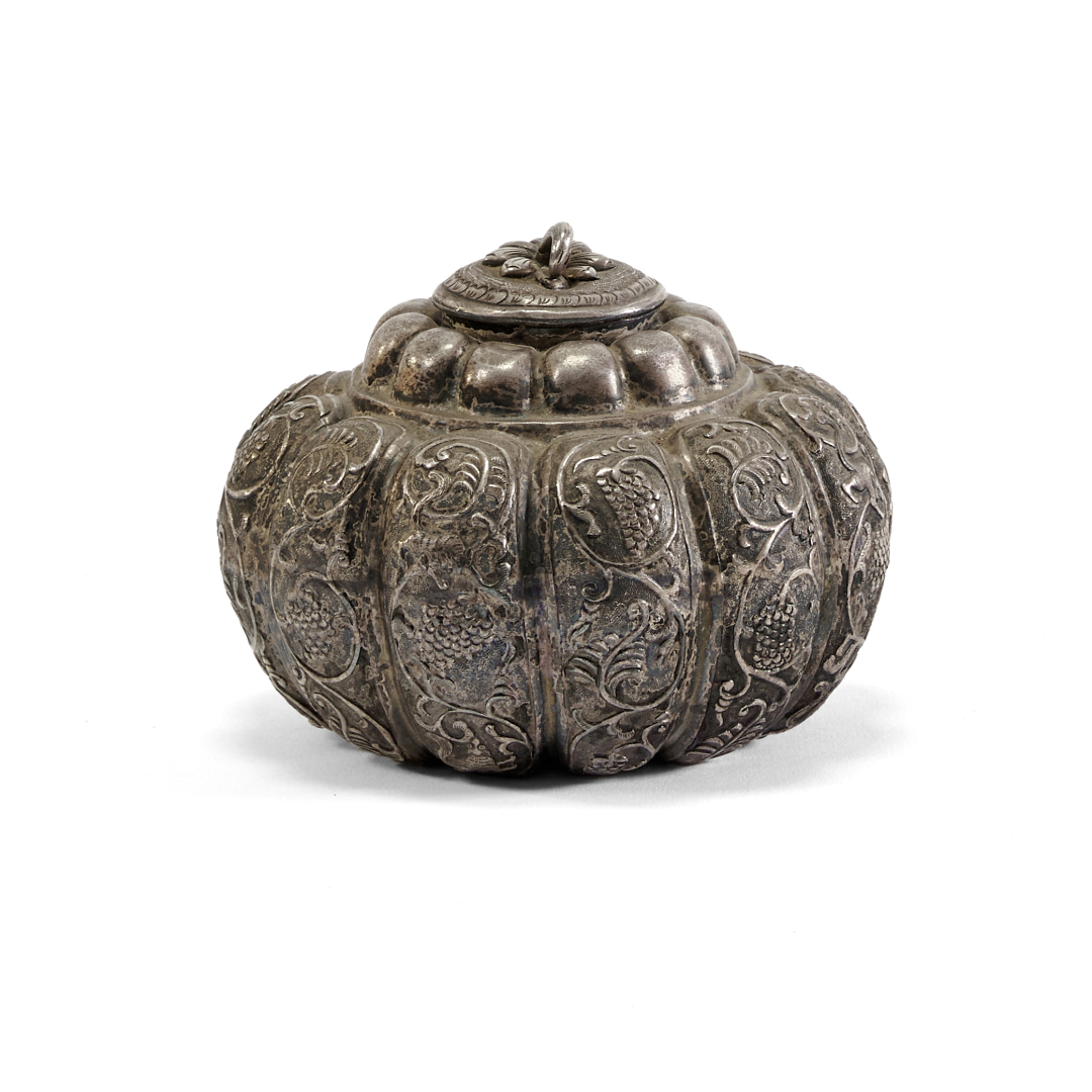 Embossed silver, shaped as a gourd with relief floral decoration.