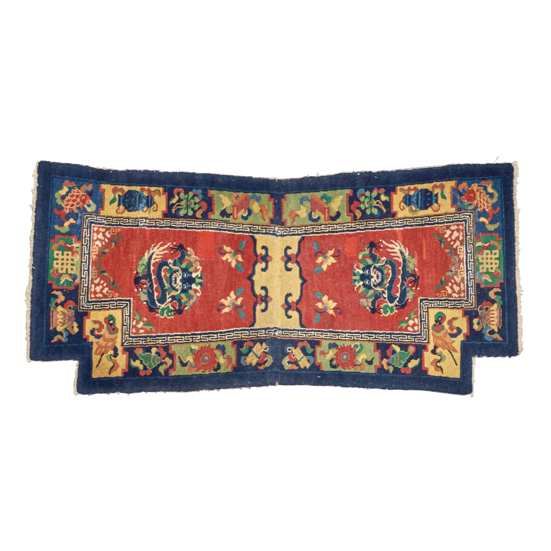 Polychrome wool, the center with two dragons within a geometric frame, outer border with Buddhist symbols.
