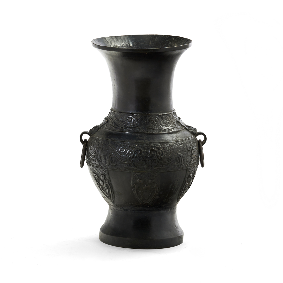 Bronze, animal head handles with movable ring, relief decoration of horizontal bands with archaic motifs.