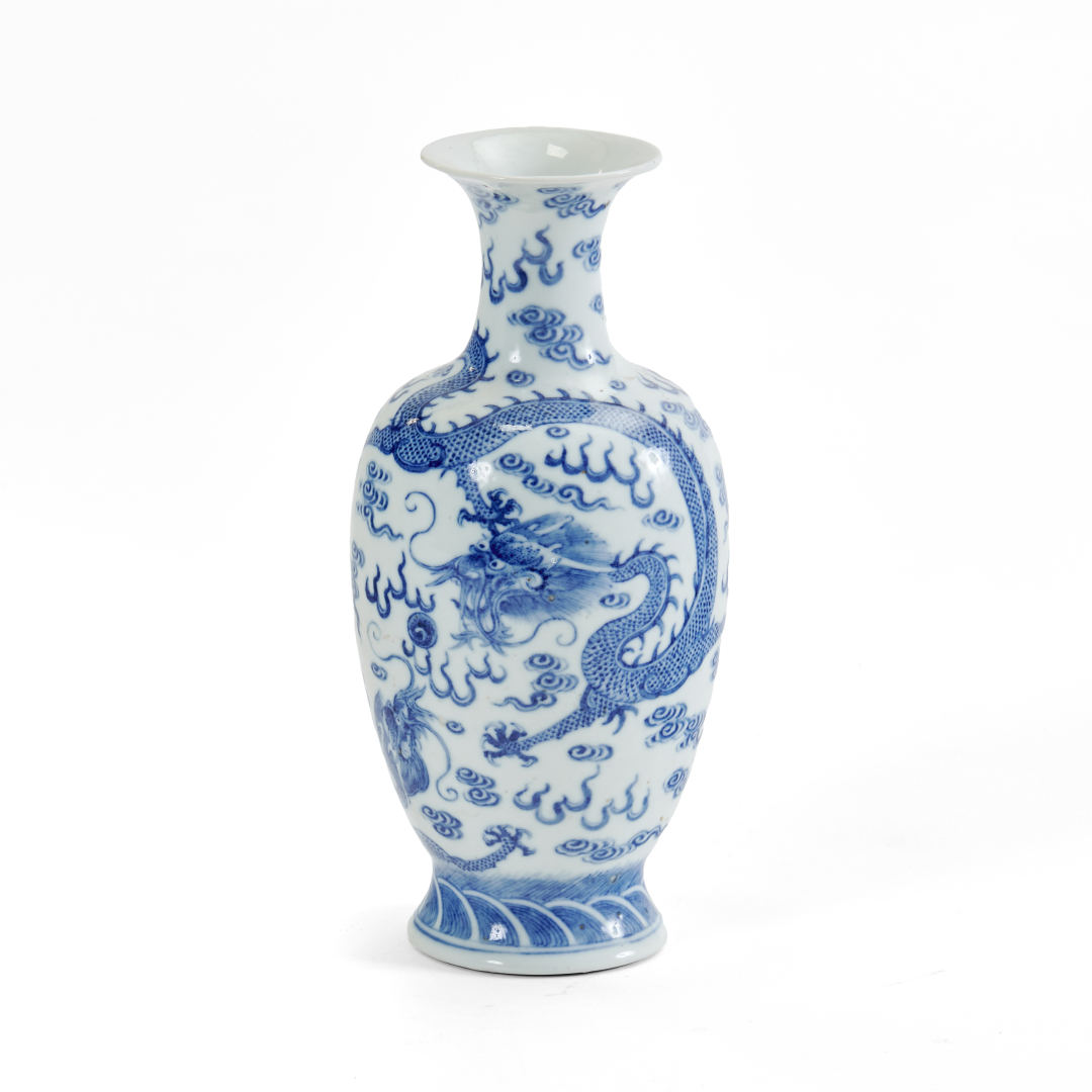 'Blue and white' porcelain, a striking decoration of dragons flying amidst clouds and darts, sea waves at the bottom, apocryphal Kangxi mark to the centre of the base.