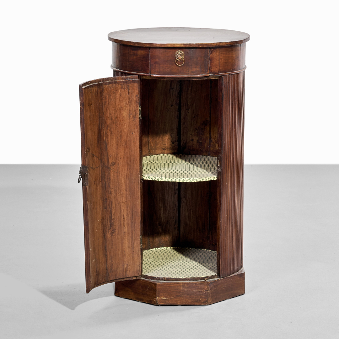 Stained walnut, with carved grooves, one door and one front drawer, on octagonal base.