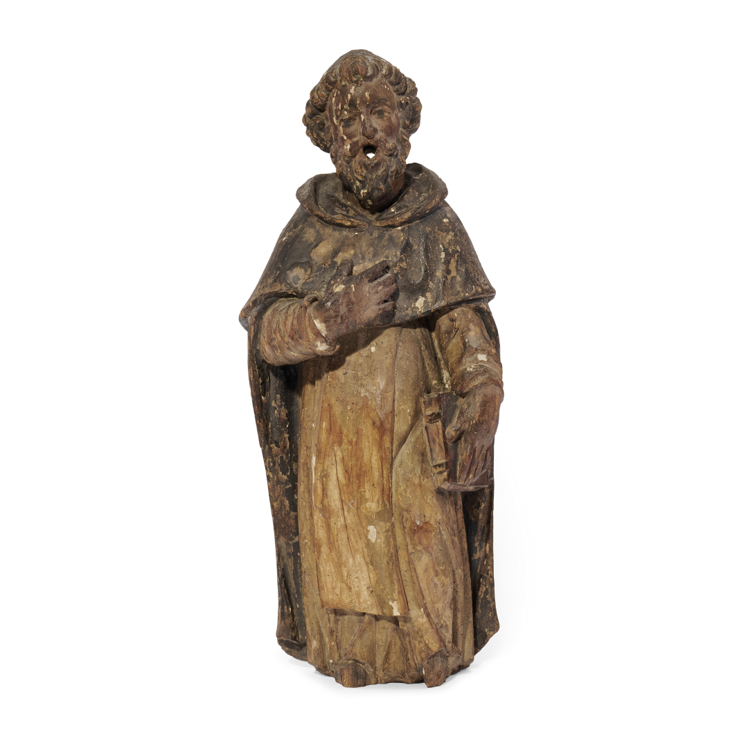 Carved and partially painted wood, depicting a standing saint.
