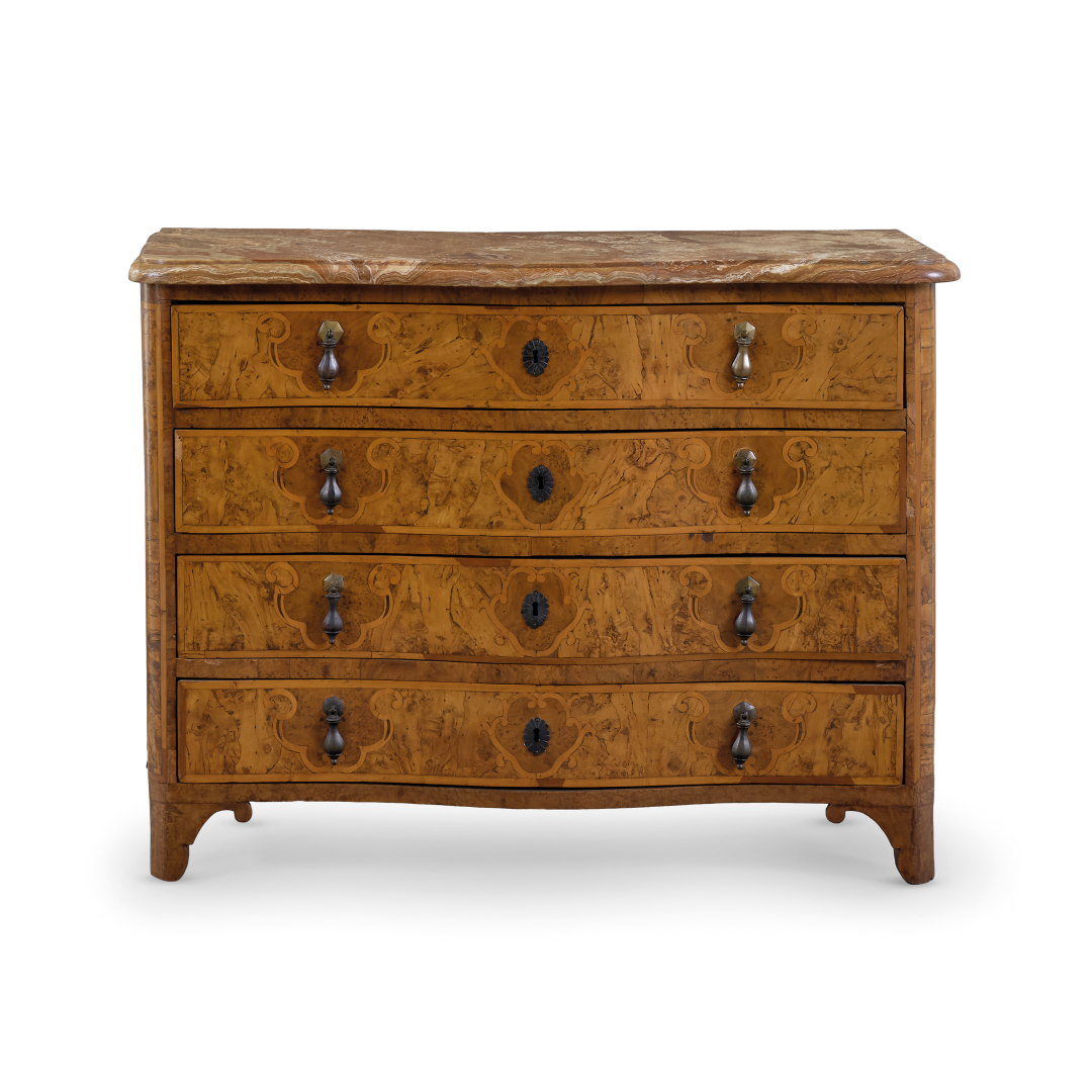 The structure of the chest-of-drawers, typically Piedmontese, is embellished with elegant boxwood ribbons reminiscent of the work of the most highly regarded masters of the 18th-Century Savoy court. It is therefore possible that, as research progresses, this skilled cabinetmaker, active in Turin around the mid-18th Century, will be identified.