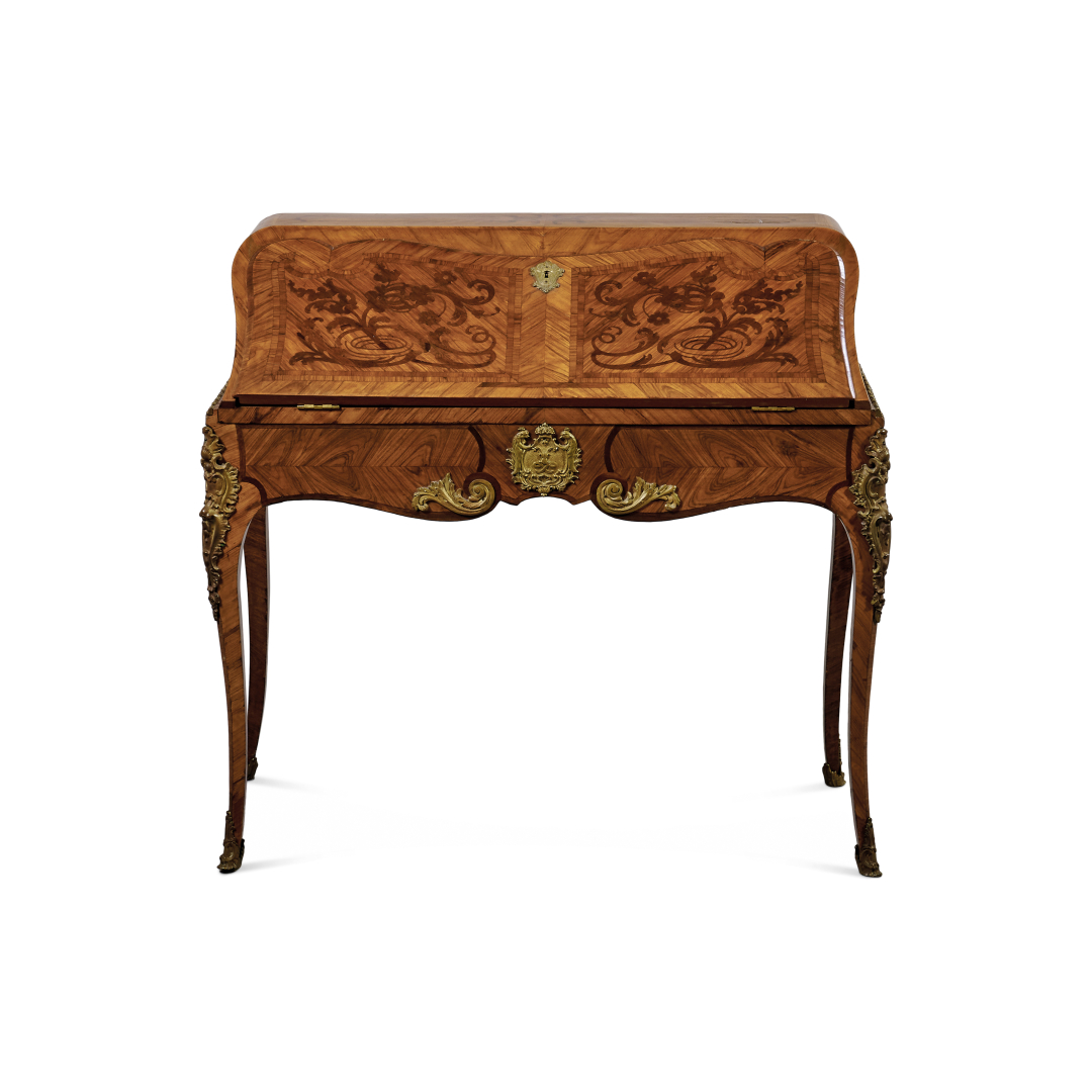 Veneered in rosewood and kingwood with ribbon and floral inlays, with gilt-bronze applications, shaped, with pidgeon holes, four small drawers and a sliding secret inside the drawer.