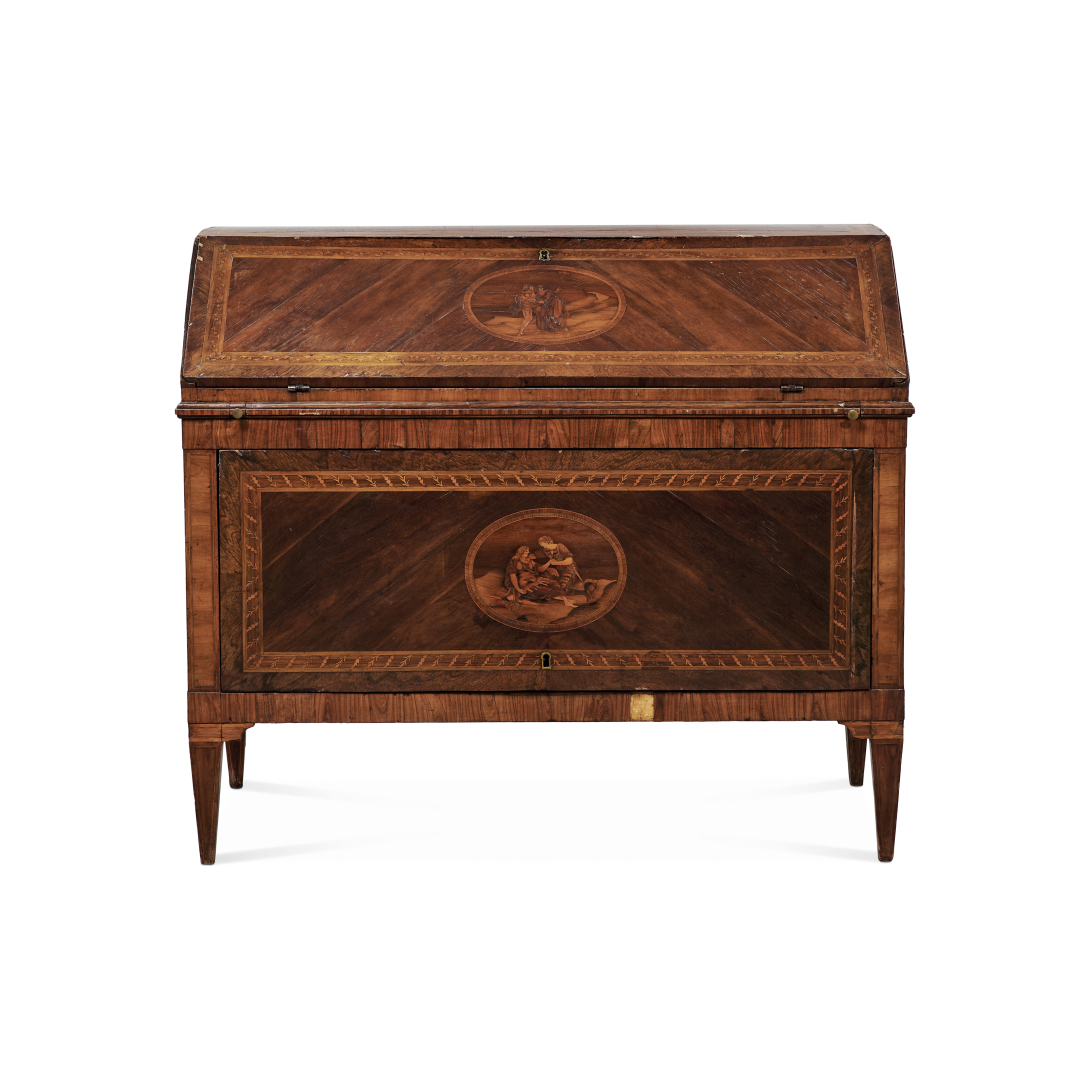 Veneered in precious woods with leaf decoration inlaid borders, central medallions on the front and on the sides depicting gallant scenes, four small drawers and a central vane inside the fallfront, underneath a sliding retractable top, which hides two drawers.