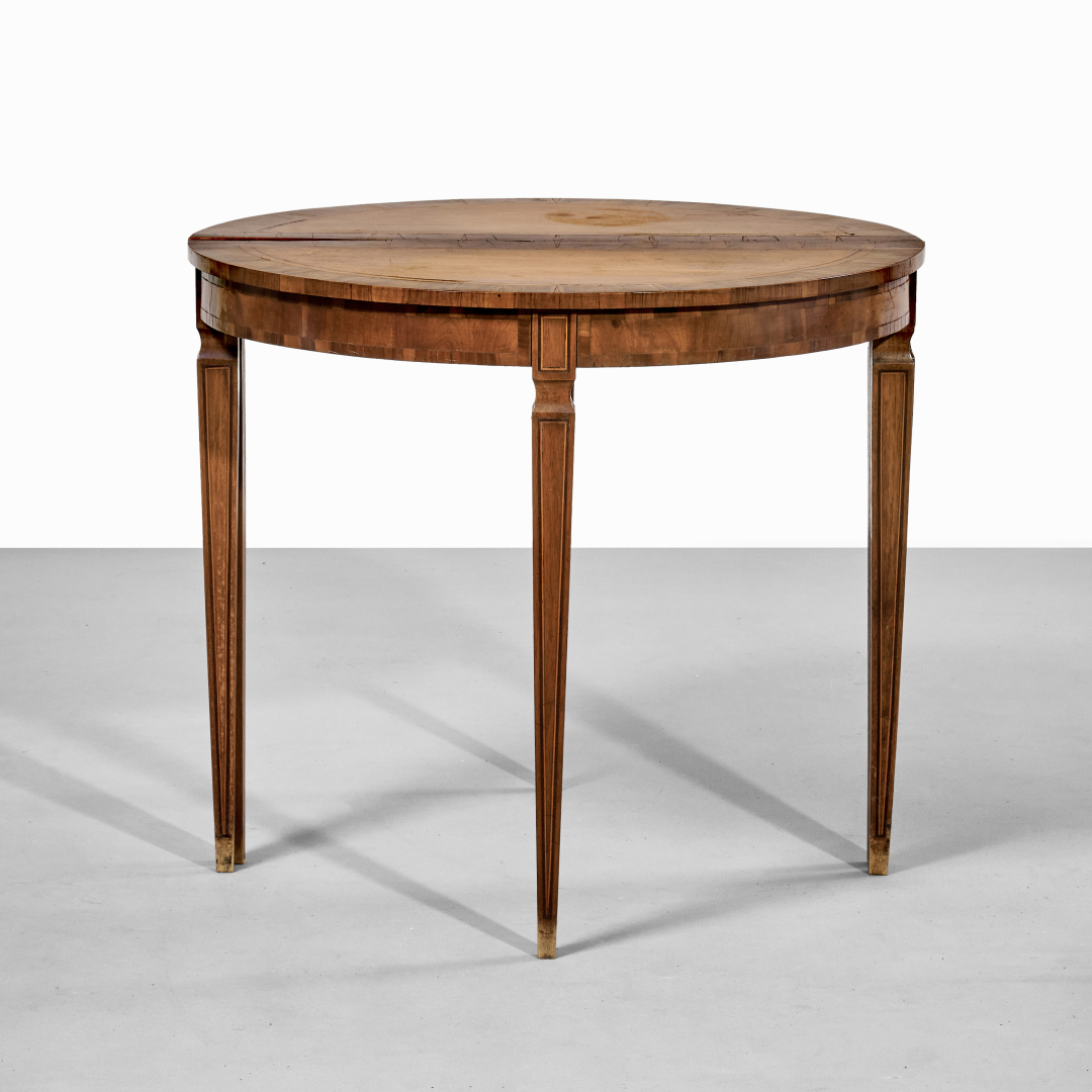 Walnut inlaid in partially ebonised and precious woods, on three tapered legs.