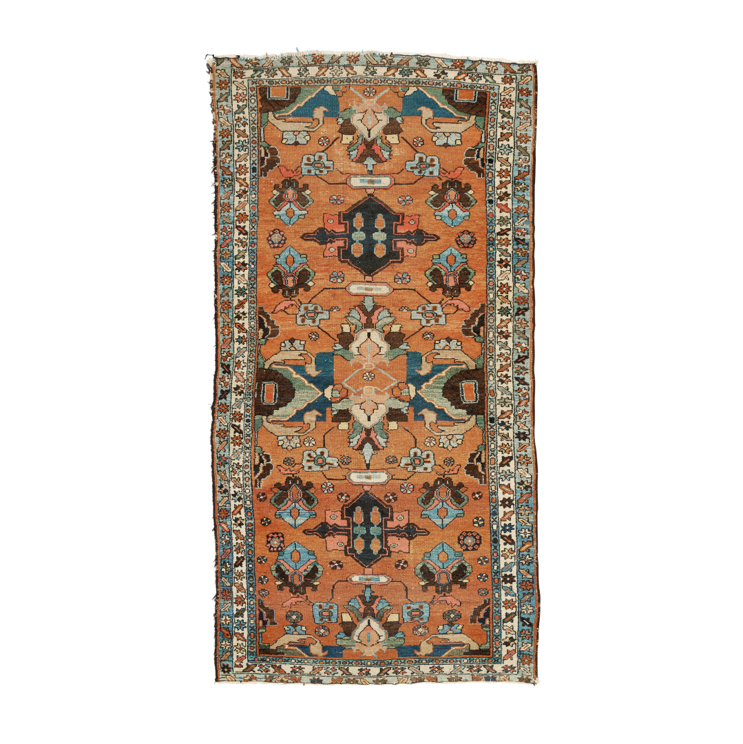 Polychrome decoration with geometric motifs on an orange, light blue and cream ground.