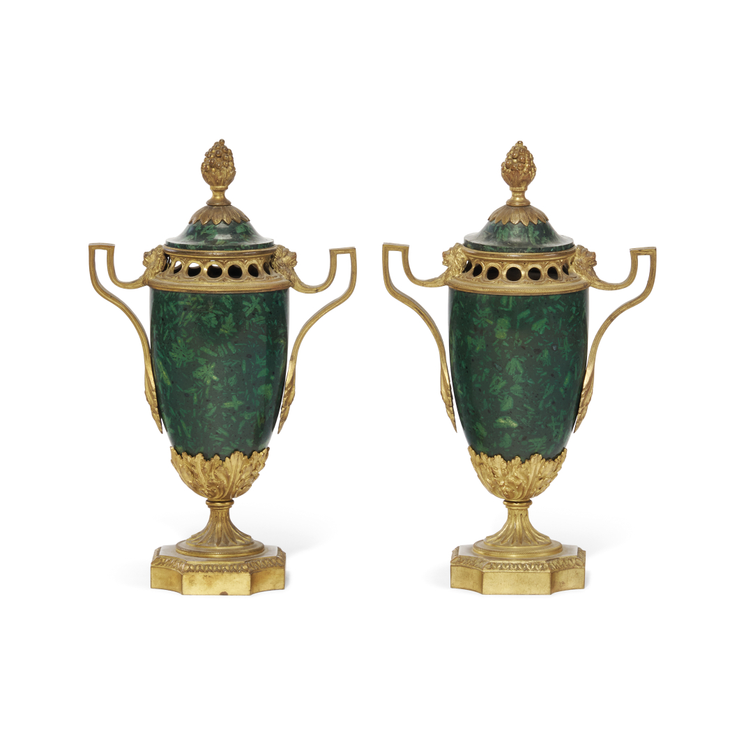 Ormolu-mounted green serpentine, with an ovoid body with curved handles and covers topped with a pine cone, on shaped bases.