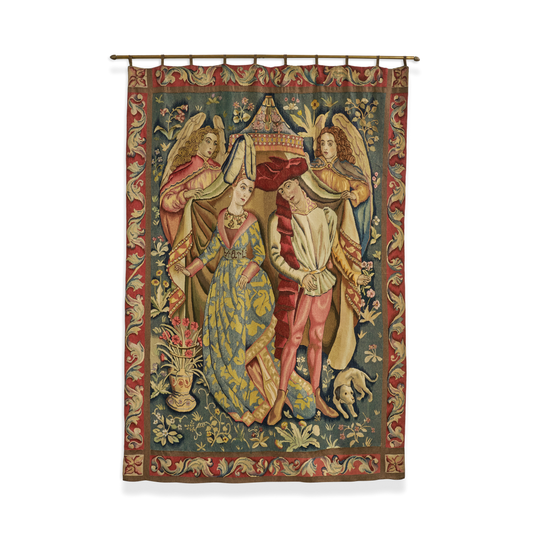 Depicting a gallant scene with a young couple beneath a canopy held by angels, within a rich floral border.