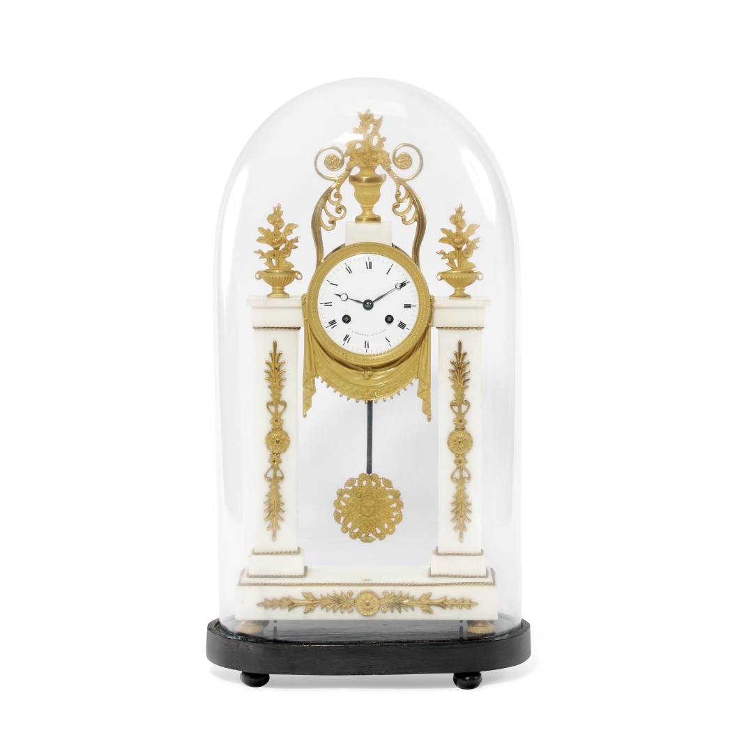 Architectural case in ormolu-mounted white marble decorated with columns. Enamel dial with Roman numerals and visible pendulum, movement with anchor escapement, silk thread suspension, hour and half-hour strike on bell. Under a glass dome