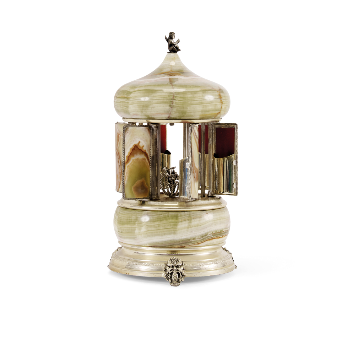 Onyx and silver-plated metal, bulb-shaped, with feet in the form of masks, topped with a figure of a musical angel.