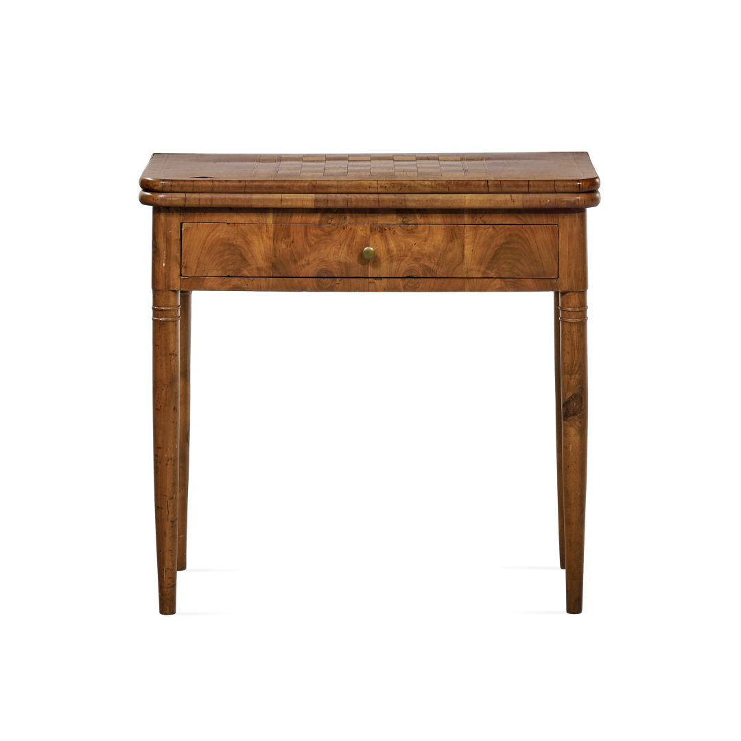 Walnut, the rectangular hinged top with inlaid chessboard, with one drawer, on tapered legs.
