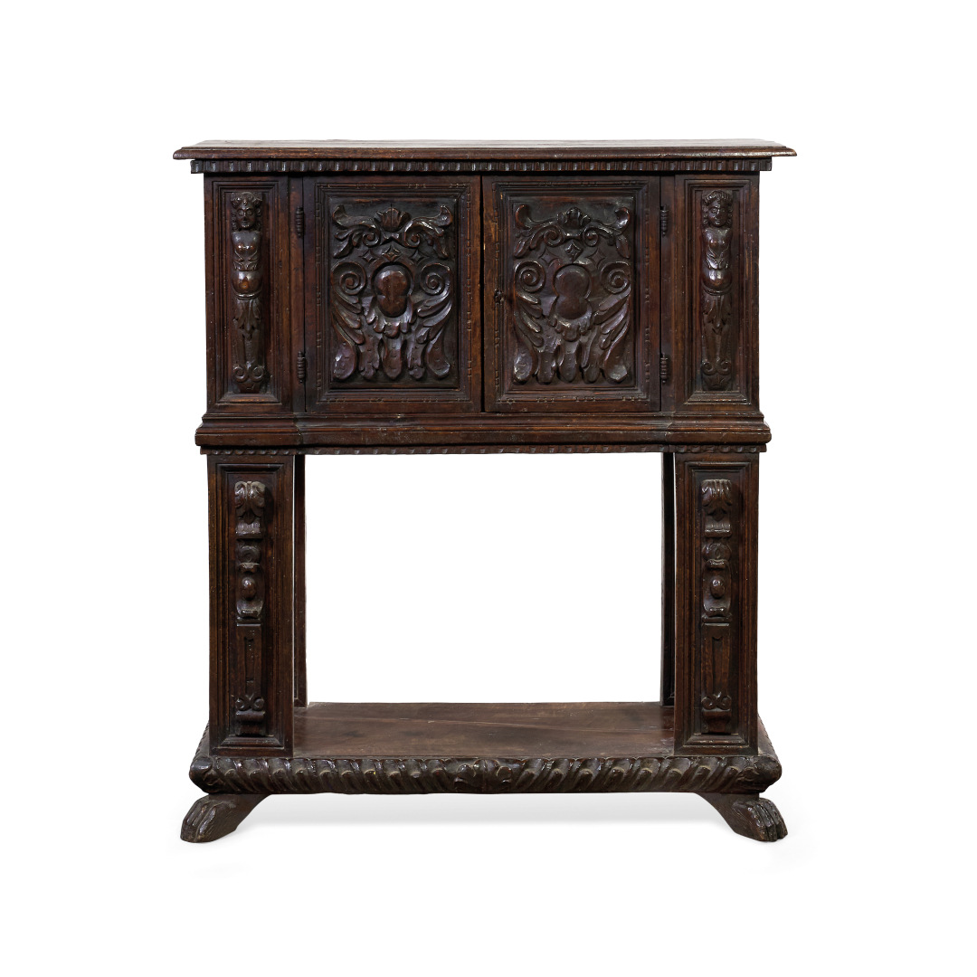 Walnut, with two doors carved with phytomorphic motifs with zoomorphic lateral columns. On a rectangular base, the lower shelf with gadrooned edge.