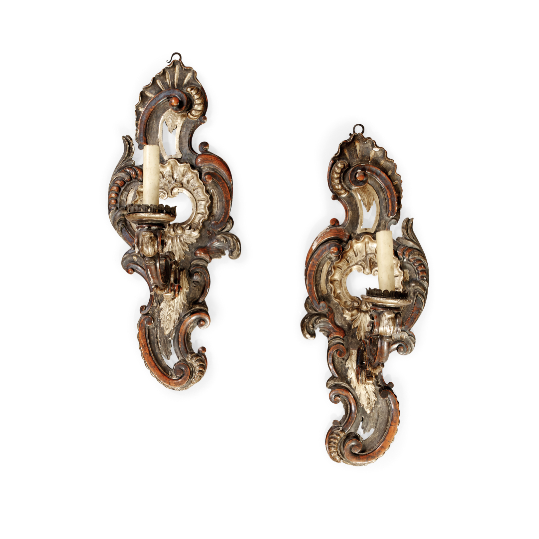 Carved, lacquered, and silver and gilt-wood, richly decorated with scrolls, acanthus leaves, and rocailles, with a shaped central arm, single light.
