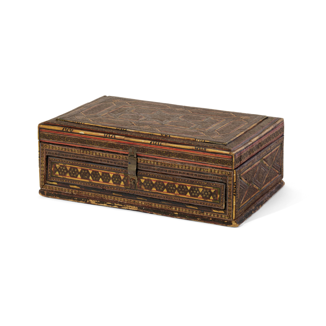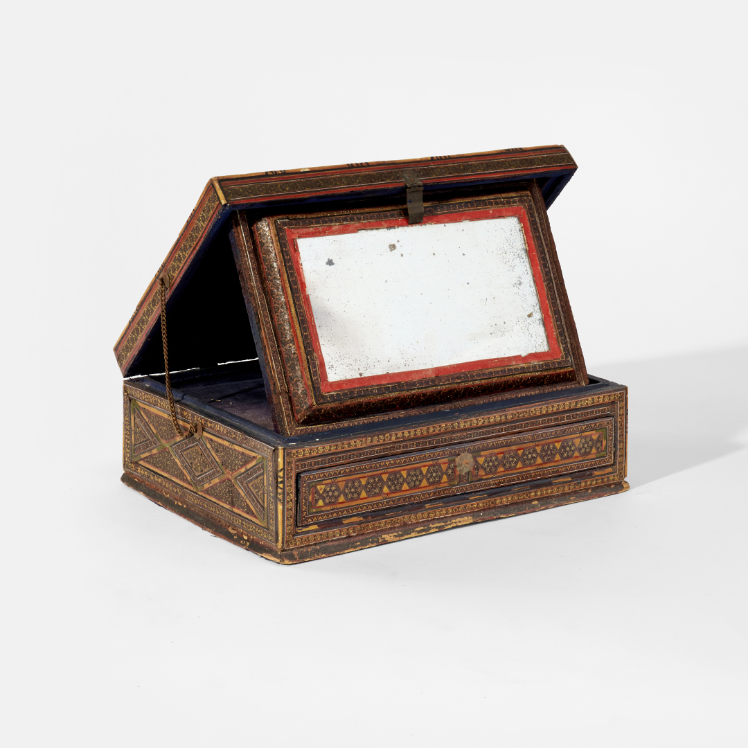 Painted and engraved wood with painted bone applications, rectangular, with upper foldable mirror and drawer with compartments.