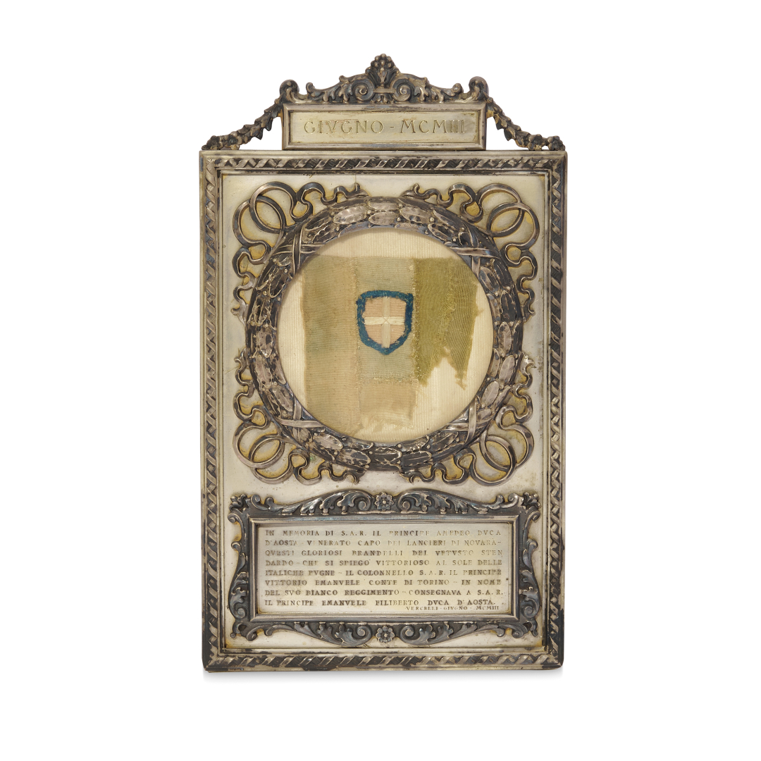 Silver and silver-plated metal casket containing the edge of the hand-embroidered Risorgimento Standard of the Novara Lancers Regiment, with engraved inscription "In memory of HRH Prince Amedeo, Duke of Aosta - venerated leader of the Novara Lancers - these glorious shreds of the ancient Standard [...]".
