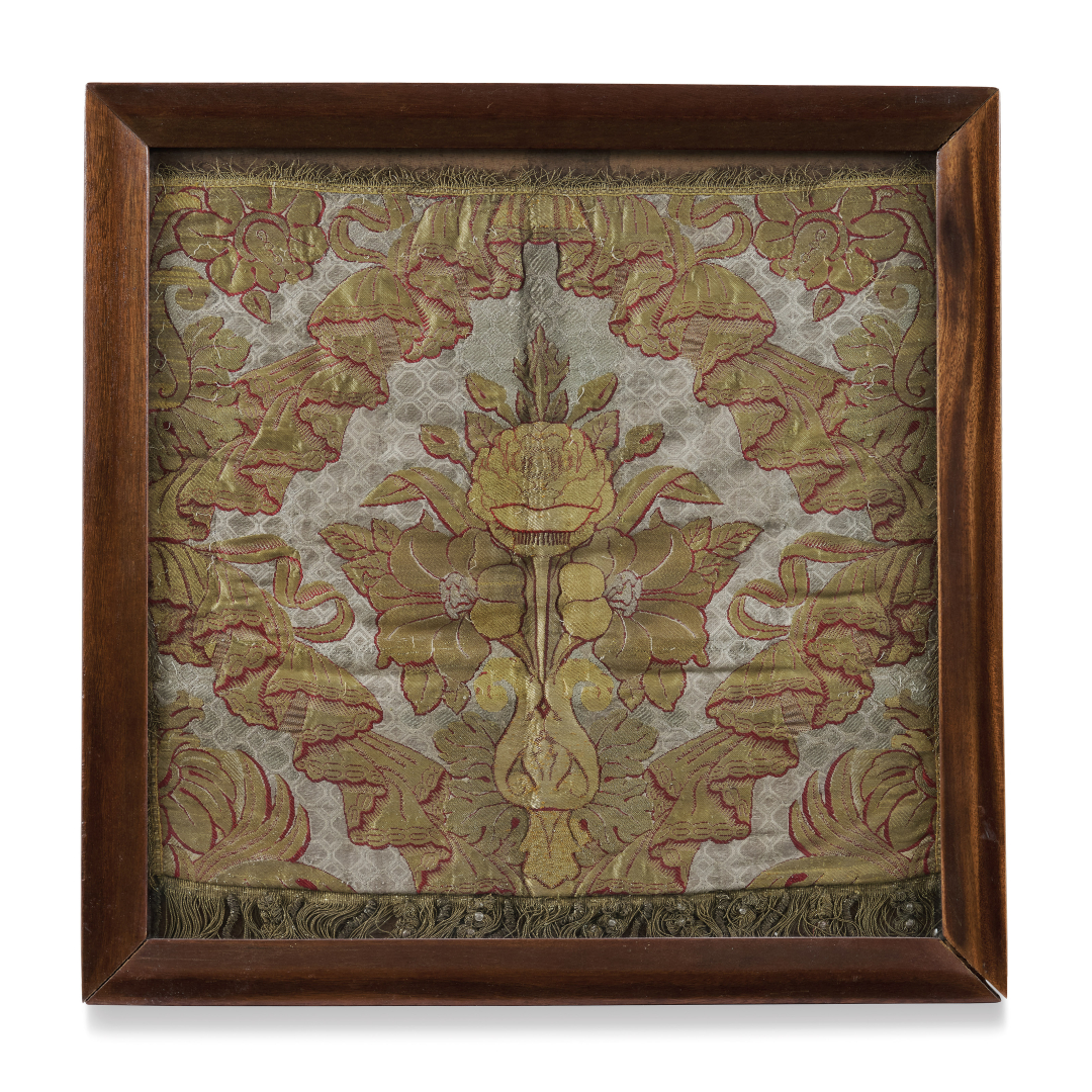 Embroidered textile with stylized floral and foliate motifs in gold and red tones on a light ground, within wooden frame.