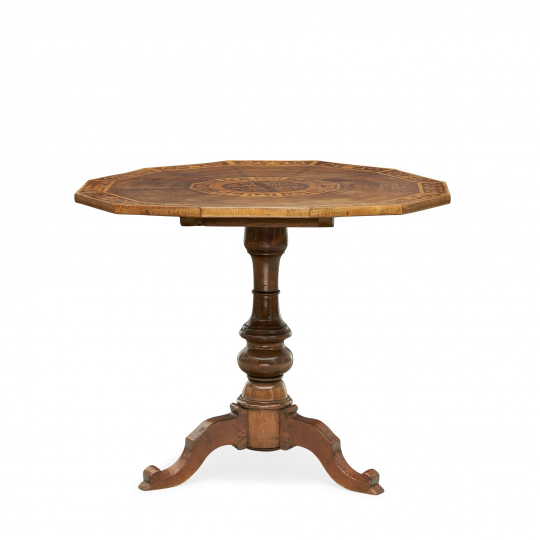 Walnut, with inlaid dodecagonal top, tripod.