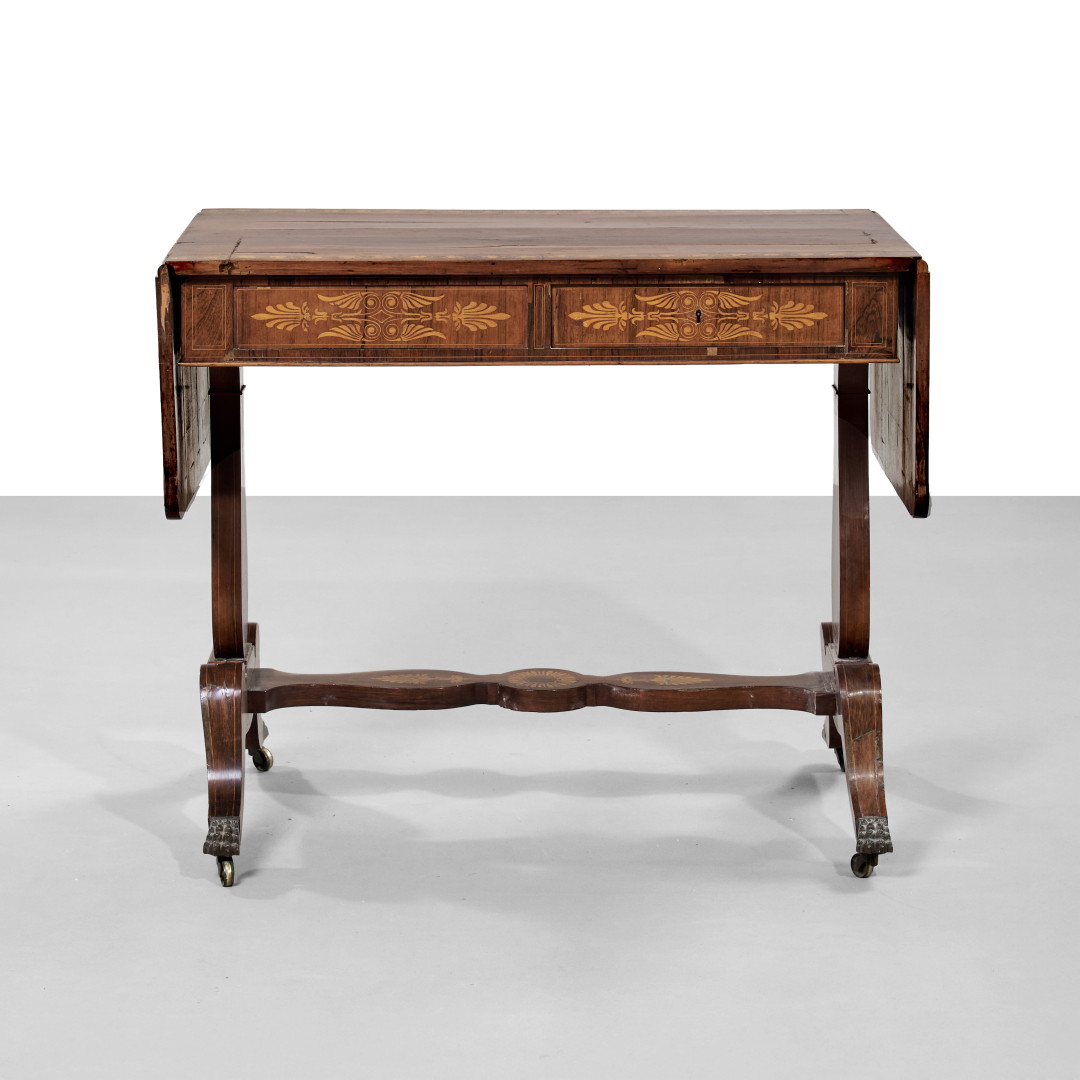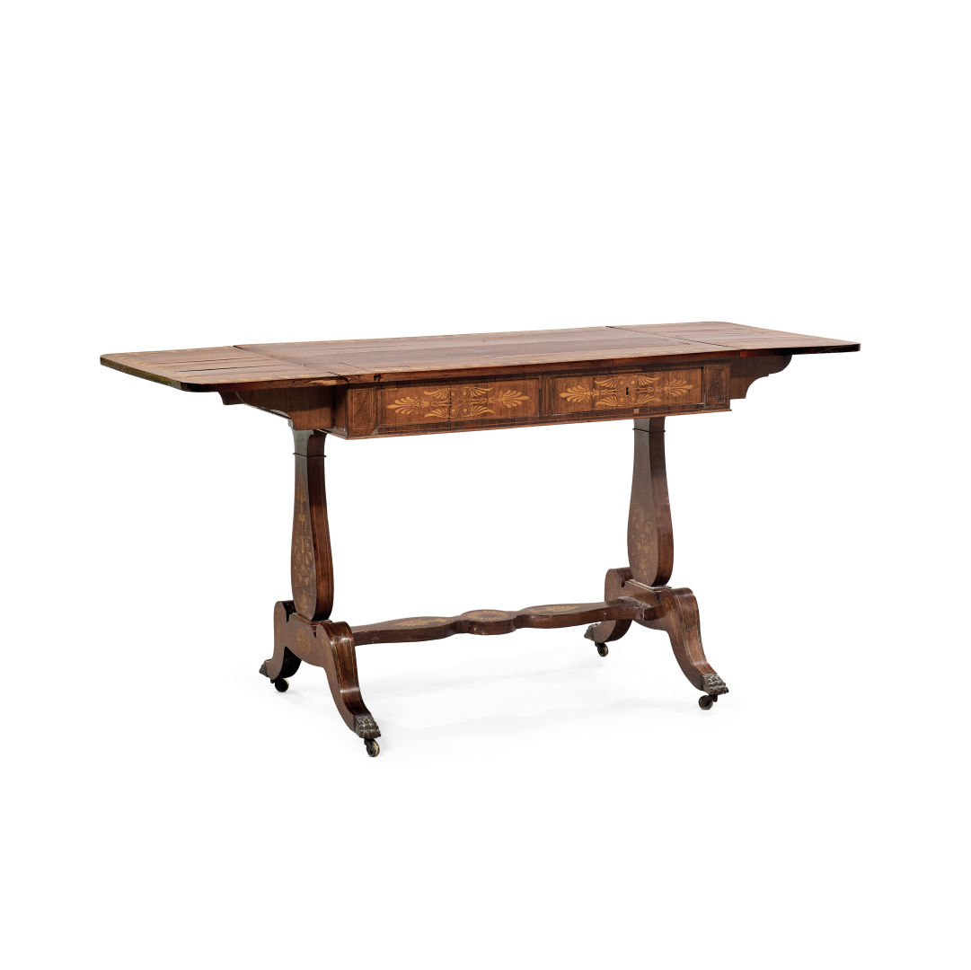 Carved and inlaid walnut, with hinged side leaves, the legs joined by a baluster crosspiece.