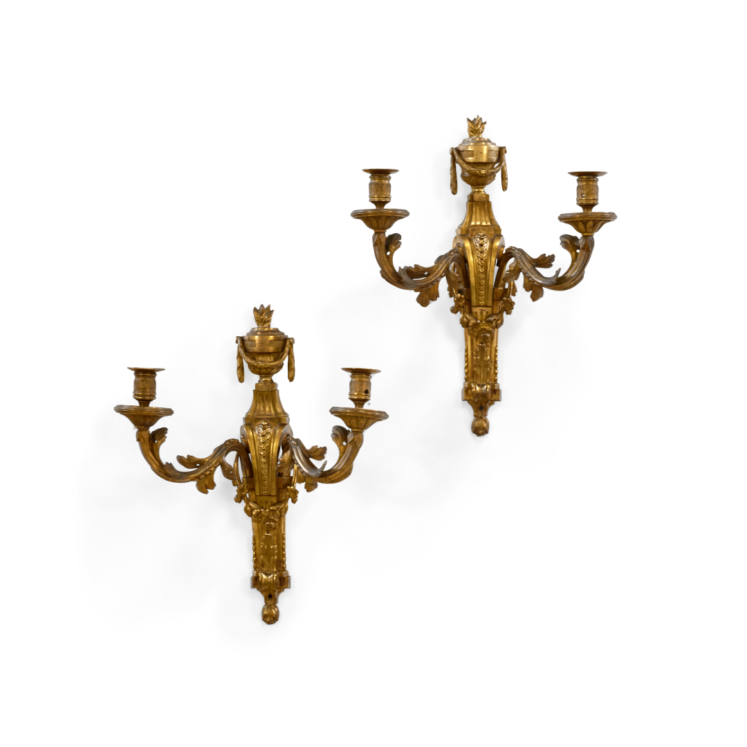 Chiselled gilt-bronze, leafy scrolls, garlands and braziers decoration, with two lights.