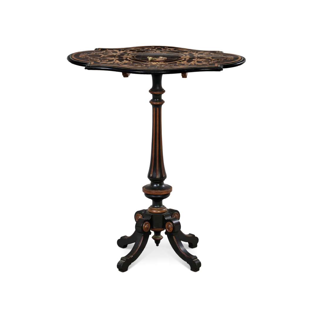Ebonised and painted wood, shaped top decorated with plant motifs and central reserve, fluted baluster shaft, on curved feet.