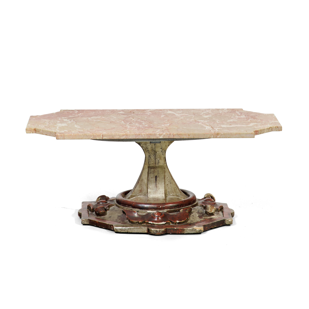 Lacquered and partially silvered wood, shaped marble top.