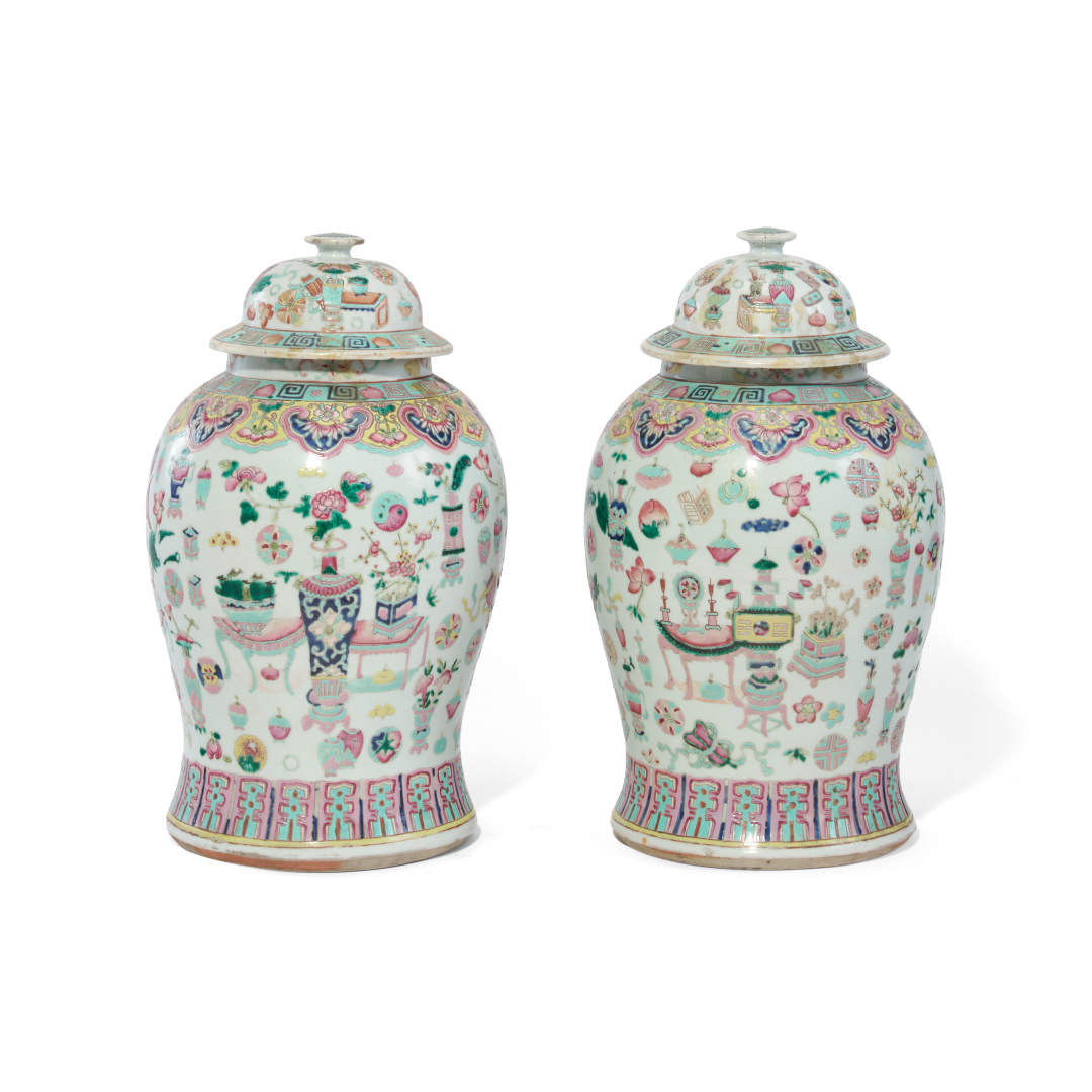 Porcelain with polychrome enamel decoration, body and lid with compositions of various objects and flowers, the lower section and the neck with bands of geometric motifs.