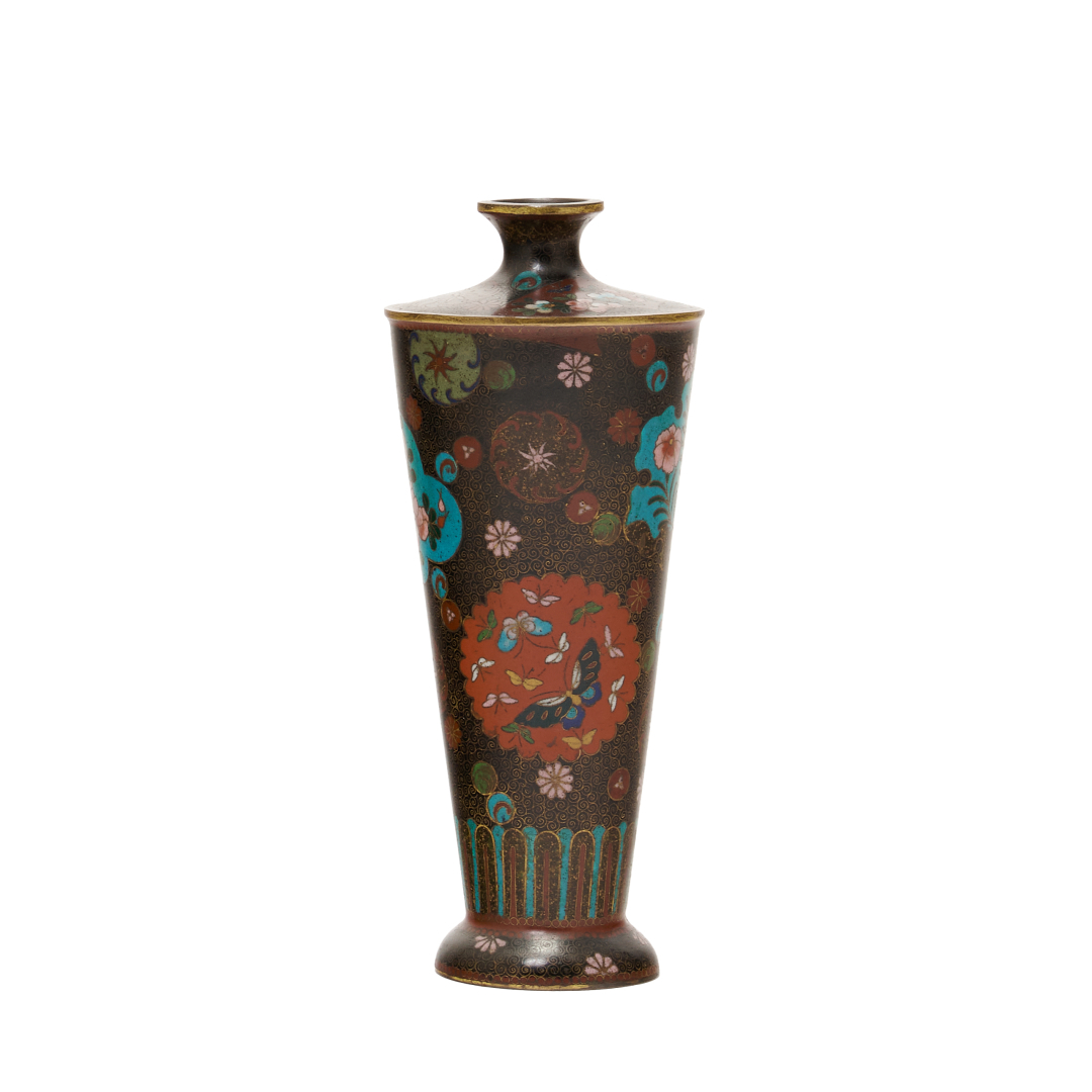 Metal decorated in polychrome cloisonné enamels with stylised floral motifs.