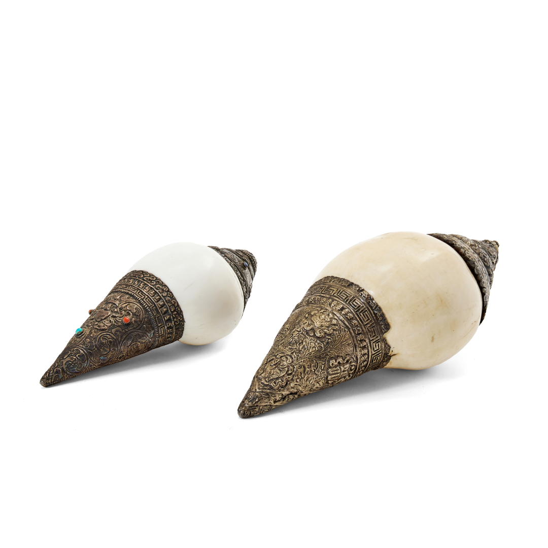 The two ends of the shells with silver-plated metal fittings and glass inlays.