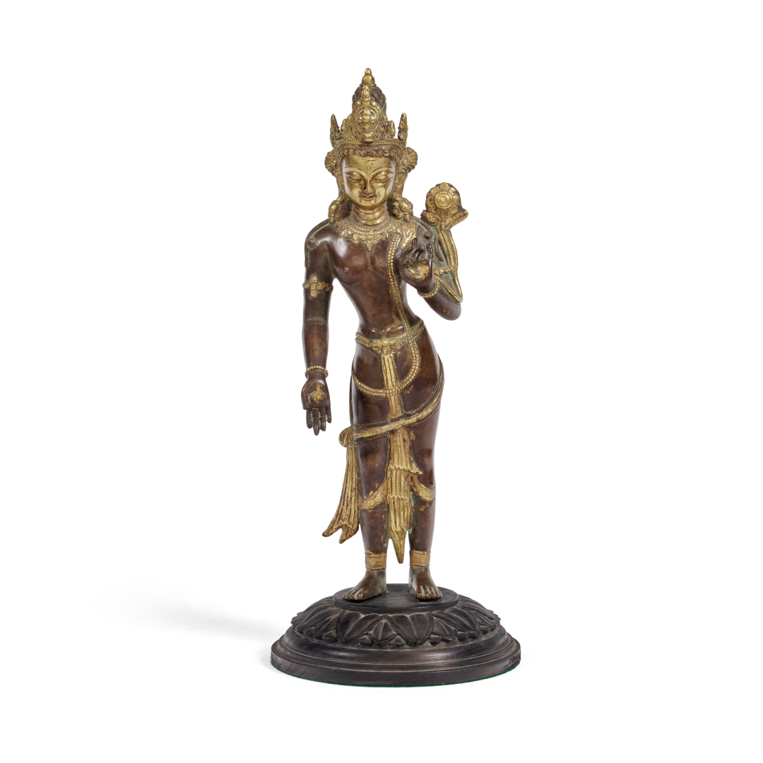Partially gilded copper alloy, the deity depicted standing on a circular base, a lotus flower on the left arm, the head surmounted by a diadem, jewels on the body.