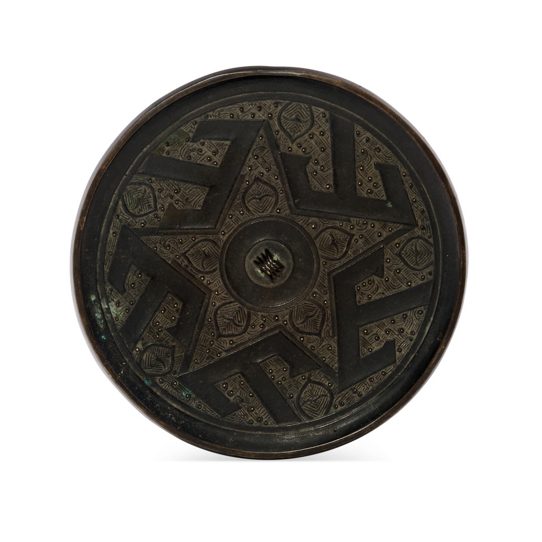 Bronze, decorated in relief with Zhou-style geometric motifs.