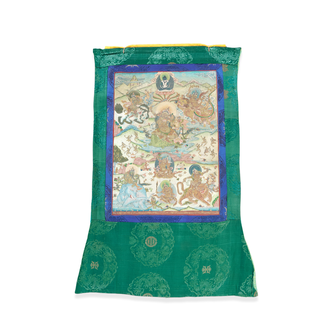 Colors on fabric, various deities of Tantric Buddhism with mythological animals in the landscape, fabric frame.