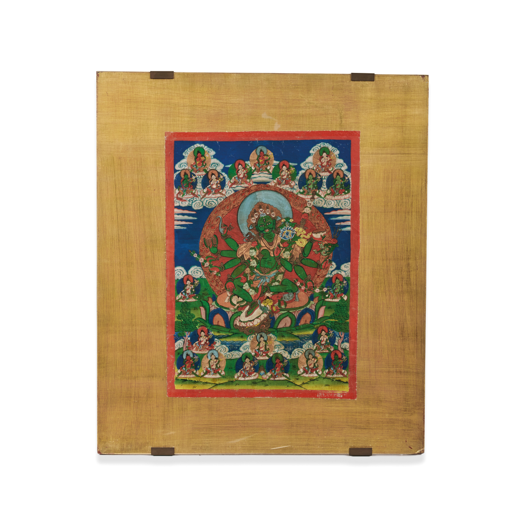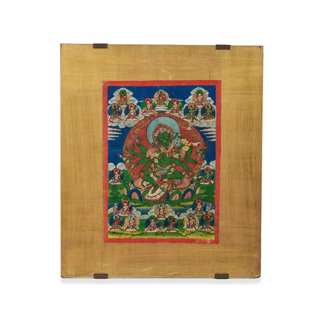 Colors on fabric, depicting the Green Tara in her manifestation as Samaya Yogini, with eight arms and eight attributes in her hands, surrounded by twenty other manifestations of Tara.