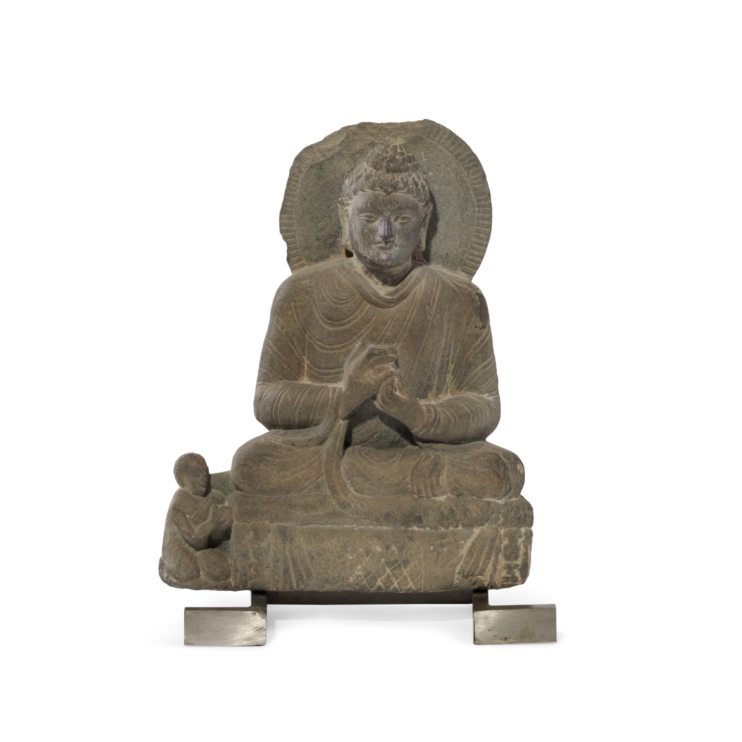 Grey schist, the deity seated on a rectangular-section base, one side with a small figure of a devotee, his hands at chest height in the dharmachakra mudra, a gesture that symbolizes the Buddha's preaching, dressed in a flowing tunic whose drapes are strikingly reminiscent of Hellenistic sculpture, the back of his head with a rounded halo.