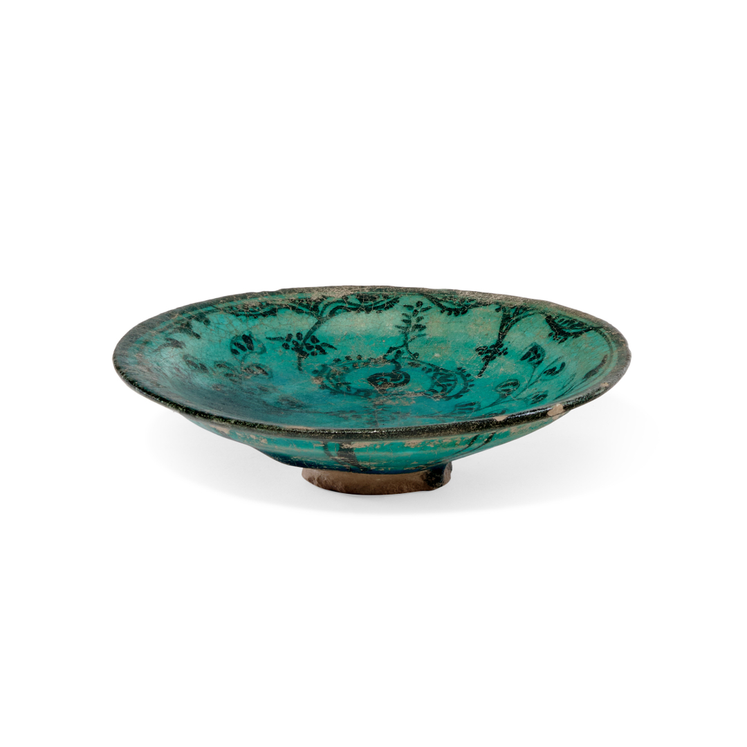 Turquoise glazed ceramics, painted in black with stylized floral decoration.